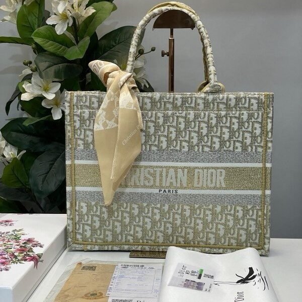 Christian Dior Book Tote Oblique Embroidery With OG Box & Dust Bag & Scarf (Gold-M929 41Cm)