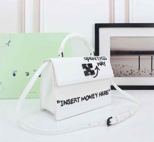 Off-White Leather Insert Gummy white with Metallic Blue Arrows At Front. Rope Handle Jitney 1.4 Shoulder Bag (D88532 White)