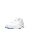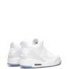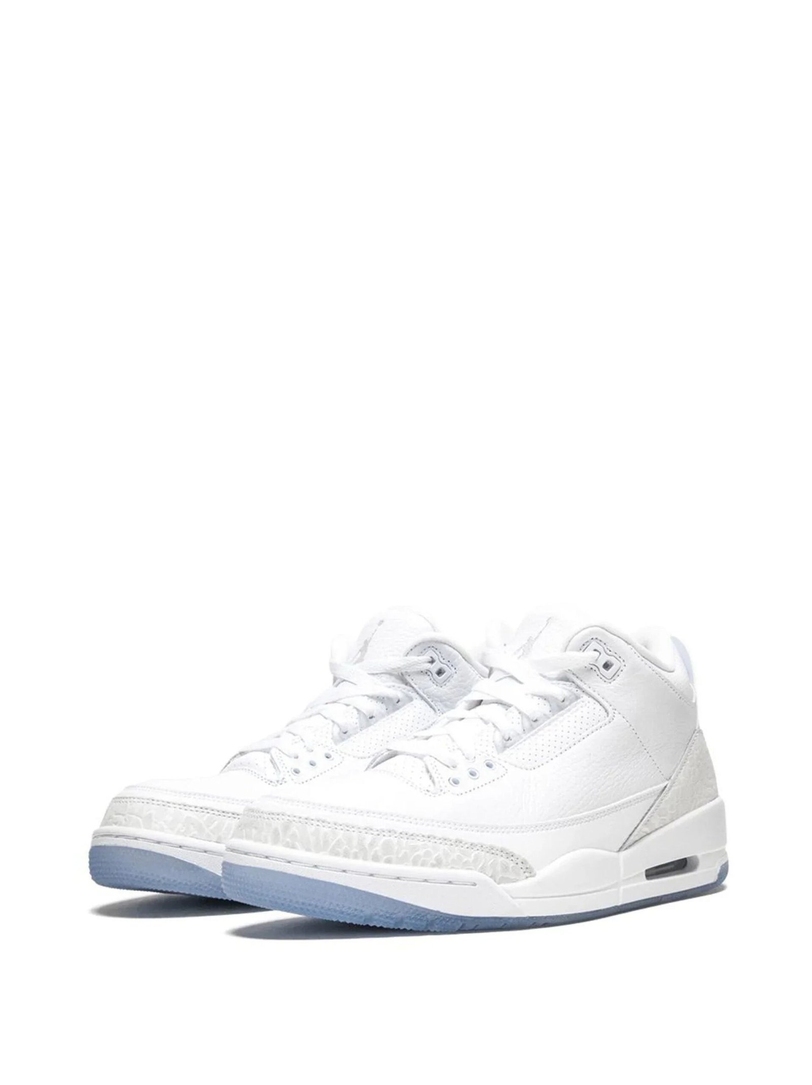 The Air Jordan 3 Retro “Pure White” sneakers by Jordan Brand feature a clean all-white colour scheme. This model features a leather upper, enhanced with white elephant print panelling, and sits atop an icy blue outsole for contrast.