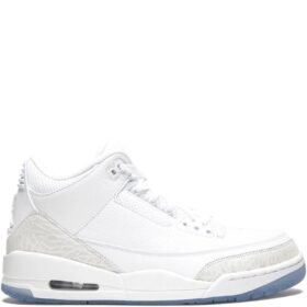 The Air Jordan 3 Retro “Pure White” sneakers by Jordan Brand feature a clean all-white colour scheme. This model features a leather upper, enhanced with white elephant print panelling, and sits atop an icy blue outsole for contrast.
